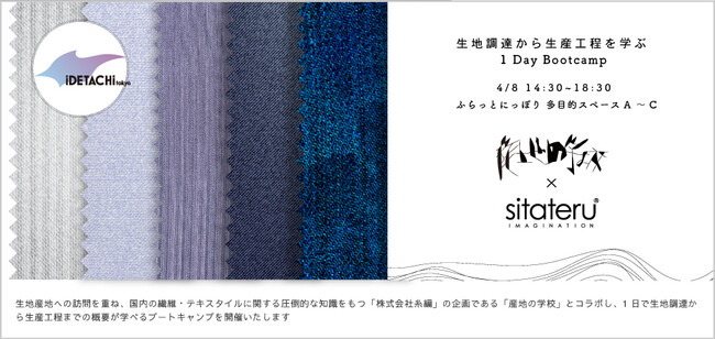 シタテル株式会社(本社:熊本県熊本市、代表取締役:河野秀和、以下シタテル)は、株式会社糸編(本社:東京都中央区、代表取締役:宮浦晋哉、以下糸編)が繊維産業・テキスタイルについて体系的に学ぶ場として開校している「産地の学校」とコラボレーションし、1日でファッションにおける生地調達から生産工程までの概要を学べる特別プログラムのイベントを開催いたします。