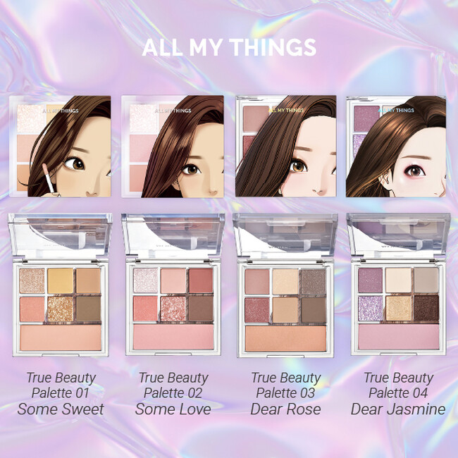 ALL MY THINGS トゥルービューティシリーズは、「私はメイクで変われる」をコンセプトに、女神降臨の作者Yaongyi(ヤオンイ)さんも企画・制作に関わり、パーソナルカラーにあわせて、アイシャドウ、チーク、グリッターまでトータルプロデュースしています。