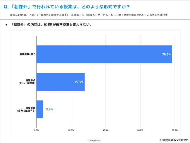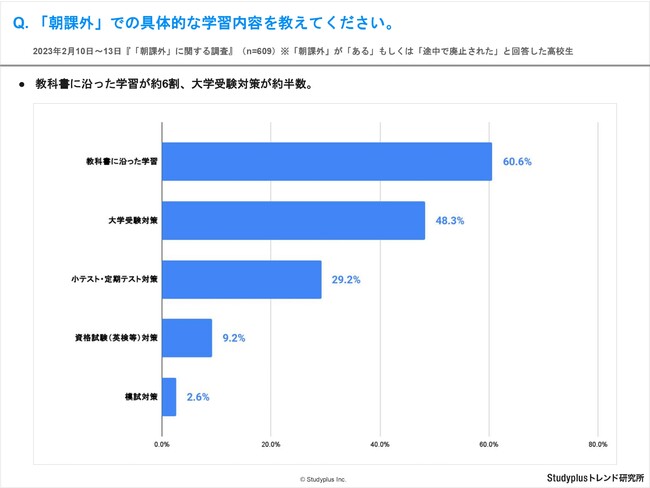 スタディプラス株式会社(本社:東京都千代田区、代表取締役:廣瀬高志、以下スタディプラス)のStudyplusトレンド研究所は、2023年2月10日(金)から2月13日(月)にかけて、学習管理アプリ「Studyplus」上で九州地方の学校に通う高校生を対象に「朝課外」に関する調査を実施、762名から調査に対する回答を得ましたので結果をご報告します。今回は、「朝課外」の具体的な授業内容を中心にご紹介します。