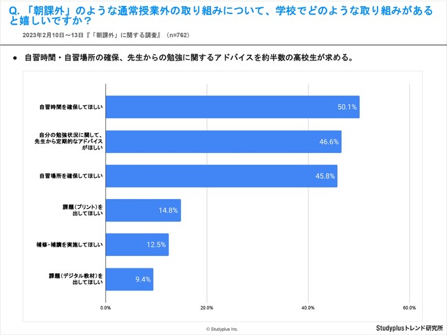 ~生徒の半数が「自習時間・自習場所の確保」「先生からの学習アドバイス」を授業外の取り組みとして求める~