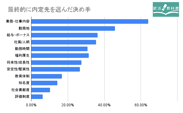 就職先を選んだ決めでは、業務・仕事内容64.1%、勤務地45.8%、給与・ボーナス36.3%