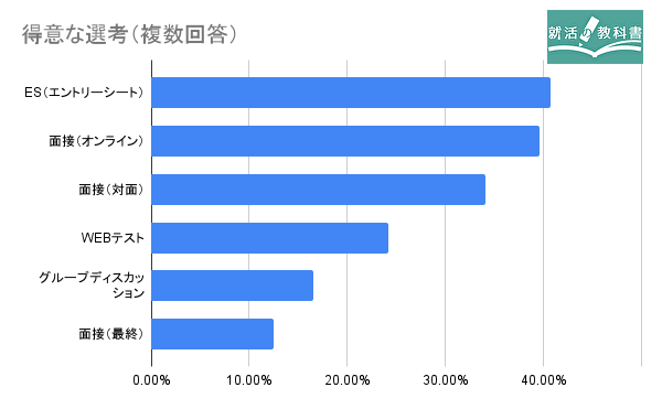 得意な選考でESと面接(オンライン)が多く選ばれ、苦手な選考ではグループディスカッションが40%以上を占めている