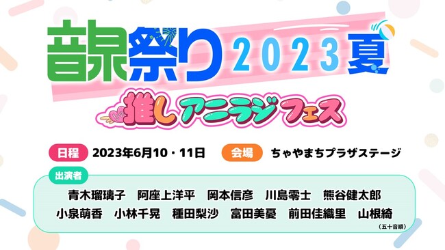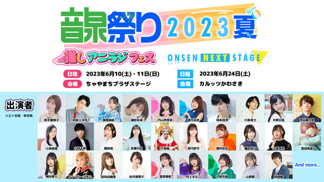 なんと今年は、番組ごとのトークイベント(大阪府梅田茶屋町)「<音泉>祭り2023夏~推しアニラジフェス~」と、合同イベント(神奈川県川崎)「<音泉>祭り2023夏~ONSEN NEXT STAGE~」2つのイベントを実施いたします。