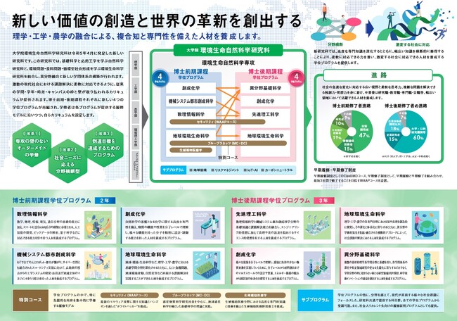岡山大学では、地域や世界のステークホルダーと協働する「共育共創」のフレームワークを活用して分野横断型、学修者本位のアウトカム基盤型学位プログラムを提供することにより、「主体的に変容し続ける先駆者」として新たな価値創造と世界の革新に貢献する人材を養成するため、以下のとおり大学院環境生命自然科学研究科環境生命自然科学専攻を設置することとなりました。