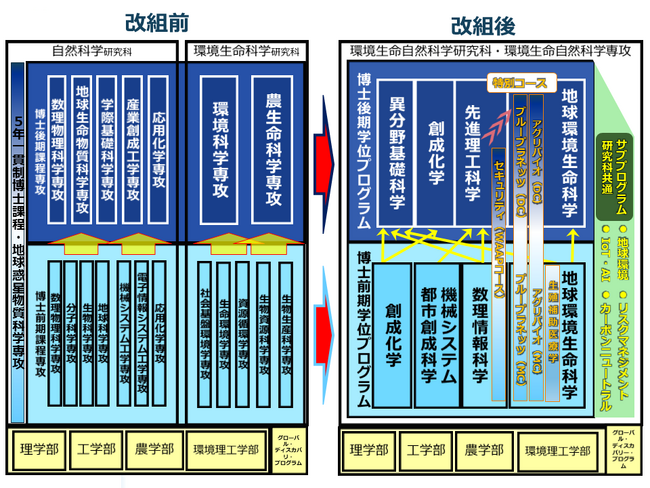 環境生命自然科学研究科は、理学部・工学部・農学部を基礎学部とし、「基礎科学や応用工学の知識と技術」に「環境問題と食料問題に関する新しい学問体系」を融合し、深化することにより、より広い社会ニーズに対応し、問題を解決できる様々な枠・壁を越える多様な人材の養成を目指し、環境生命自然科学専攻1専攻を置き、学位プログラム制を導入します。