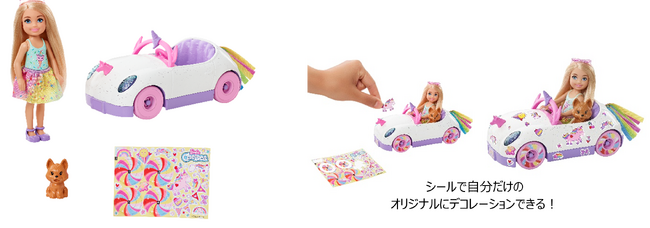 チェルシーとペットの子犬、ユニコーンにインスパイアされたかわいらしいオープンカーでドライブを楽しめるプレイセットです。オープンカーはキラキラした白いボディとパープルの縁取り、ユニコーンのオーナメントとレインボーのしっぽがついた、ファンタジックなデザインになっています。また、付属のステッカーシートで車を自由にカスタマイズもできます。チェルシーはかわいいピンクのサングラス、パープルのくつ、ユニコーンをテーマにしたトップス、星のついているスカートを着ておしゃれも楽しみながら遊ぶことができます。