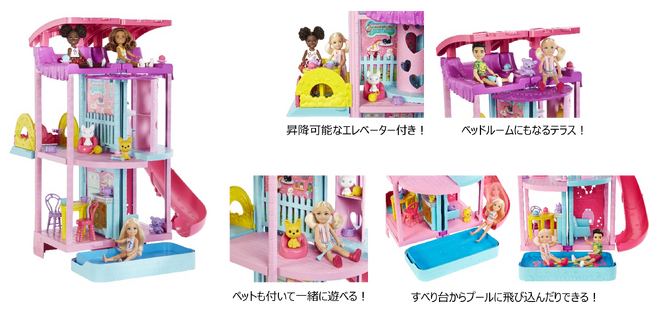 チェルシーとおともだちが遊べる3階建ての楽しいおうちは、12のプレイエリアで、20種類以上の小物がついていて、様々な遊び方を考えて360°どこからでも楽しめるプレイセットです。キッチンとダイニング、リビング、バスルーム、ペットルーム、ベッドルーム/テラス、プール/ボールプールなど多くのお部屋があるので、シチュエーションを考えてごっご遊びができます。また、チェルシーとおともだちはダイニングでティーパーティーをしたり、リビングでくつろいだり、ペットルームで付属のペットのこいぬやこねこと遊んだり、すべり台でプールに飛び込んだりできます。