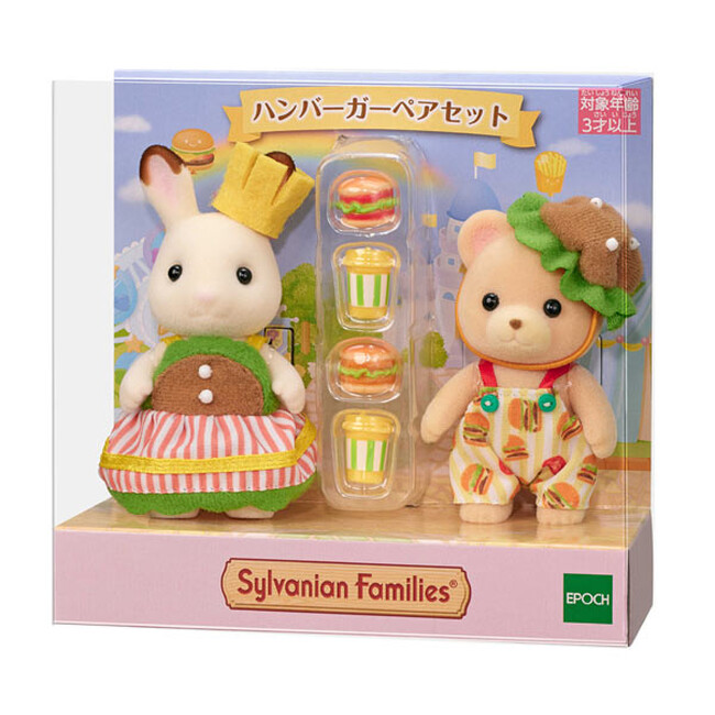 ハンバーガーデザインの洋服を着たショコラウサギの女の子、クマの男の子のペアセットです。ハンバーガーとドリンクの小物もついています。