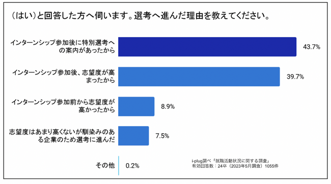 インターンシップへ参加した企業の選考へ進んだ理由で最も多い回答が「インターンシップ参加後に特別選考への案内があったから」でした。次いで、「インターンシップ参加後、志望度が高まったから」が39.7%でした。一方で「参加前から志望度が高かったから」と回答した学生はわずか8.9%。インターンシップへの参加が、志望度に大きな影響を与えることが推察できます。