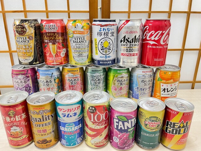 ウーロン茶、コーラ、ジンジャエール、オレンジジュース、アップルジュース、ラムネ、ストレートティー、コーヒー