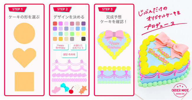 デザインパターンは7万×24色!自宅のPCやスマホから公式サイトへアクセスし、選択肢を選ぶたびに変化するイラストを確認しながら誰でも簡単にケーキのデザインをカスタマイズ&ご注文いただけるシステムです。