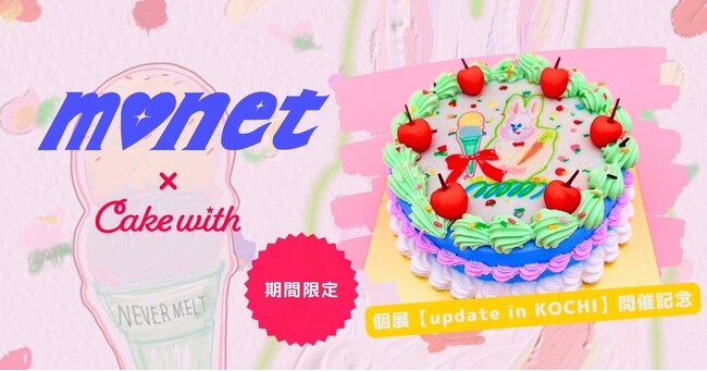 株式会社ワインライスが運営する「自分だけのケーキをプロデュース」できるWEBサイト「Cake with」は、2023年6月6日(火)~6月30日(金)の期間限定でアーティストmonet(モネ)の個展「update in KOCHI」開催を記念し、公式WEBショップ(https://cakewith.jp/)にてコラボレーションケーキを販売いたします。