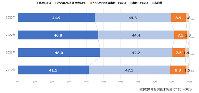 出世意欲について、「出世したい」が前年比2.0pt減の89.2%だった(「出世したい(44.9%)」+「どちらかというと出世したい(44.3%)」の合計)。2019年以降は増加傾向であったが減少に転じた。