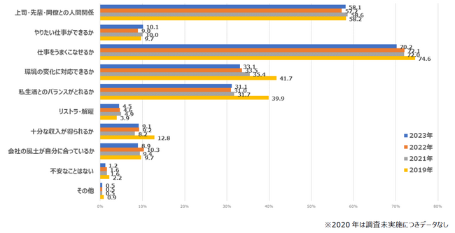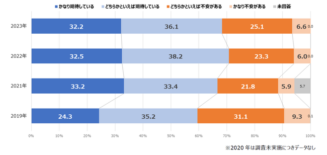 社会人生活に対する“期待の度合い”について、「期待している」と答えた人は前年比2.4pt減の68.3%(「かなり期待している(32.2%)」+「どちらかといえば期待している(36.1%)」の合計)だった。2019年~2022年の同調査では「期待している」が増加傾向であったが、2023年では減少に転じた。社会人生活に感じている不安で最も多かったのは、「仕事をうまくこなせるか」で前年比1.9pt減の70.2%だった。前年に比べ上昇しているのは、「上司・先輩・同僚との人間関係」が前年比0.9pt増の58.1%、「やりたい仕事ができるか」が前年比1.1pt増の10.1%で、人間関係やキャリアビジョンに関する不安が増加していることが分かる。【図2、3】