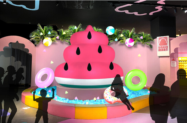 ウンコ・ボルケーノの周辺を彩るボールプールが、涼しげな水色の「うんこサマープール」に大変身。プロジェクションマッピングにはこの夏だけの映像が追加となります。