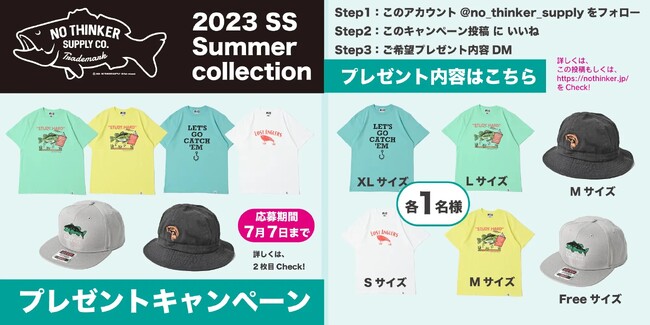リリースと同時に『NO THINKER SUPPLY』公式インスタグラムアカウントにて、2023年6月21日(水)から 2023年7月7日(金)の期間中、2023 SS summerコレクションアイテムから、夏に嬉しいTシャツとキャップが抽選で6名様に当たるプレゼントキャンペーンを実施いたします。