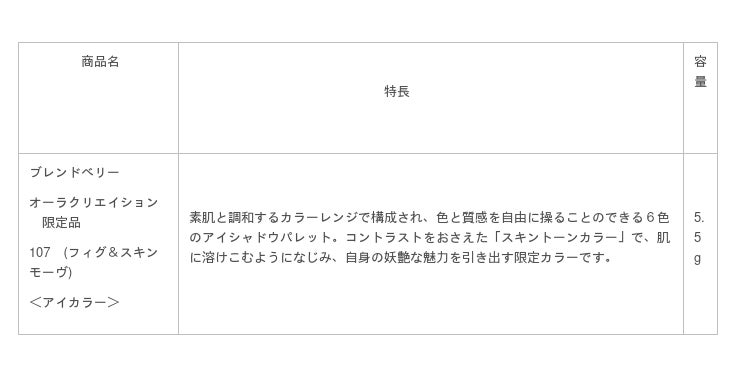 ブレンドベリーは、ブランド独自の色彩理論をもとに、どんな肌の色にもなじむカラーリングパターン「skin(スキン) harmonizing(ハーモナイジング) color(カラー)」を取り入れた商品を展開しています。今回発売する「オーラクリエイション 限定カラー 107 フィグ&スキンモーヴ」は、コントラストをおさえたスキントーンで全体をまとめた6色パレットです。肌の色と優しく溶けあい、目もとに奥行と透明感を演出。透け感のあるナチュラルな仕上がりでありながら妖艶な美しさを演出します。昨今人気の高まっている、透明感を感じさせるメイクや、あどけなさが漂う儚げな印象に仕上げることができます。