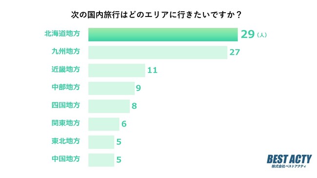 アウトドアメディア「TACKLE NOTE(https://tacklenote.com/columns/)」を運営する株式会社ベストアクティ(https://tacklenote.com)は、10代から60代までの100人に【次の国内旅行で行きたいエリア】についてアンケートを行いました。