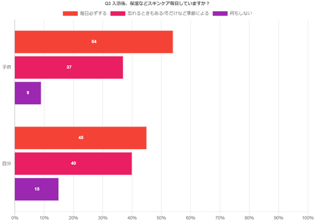入浴後の肌ケアをしているか尋ねたところ、敏感肌の子供、自分共に毎日ケアしているとお答え頂いた方が多い結果となりました。しかし、自分の肌ケアについては忘れてしまう事があると答えた方が次いで多く、お風呂を出た後に子供のケアは優先しているが、12歳以下のお子様だとなかなかお世話に手が掛かり、自分の肌ケアを忘れてしまう方も多いようです。
