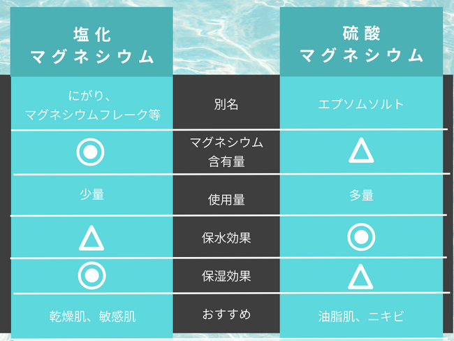 マグネシウムの含有量が塩化マグネシウムの方が多く含まれているので、バスソルトとして使用する際に、少ない量で効果を得ることができます。また、保湿効果に優れており、乾燥しやすい方、肌が敏感な方に向いています。硫酸マグネシウムは、保水効果や皮脂を取り除く作用があるので、油脂肌の方やニキビができやすい方などにおススメと言えます。