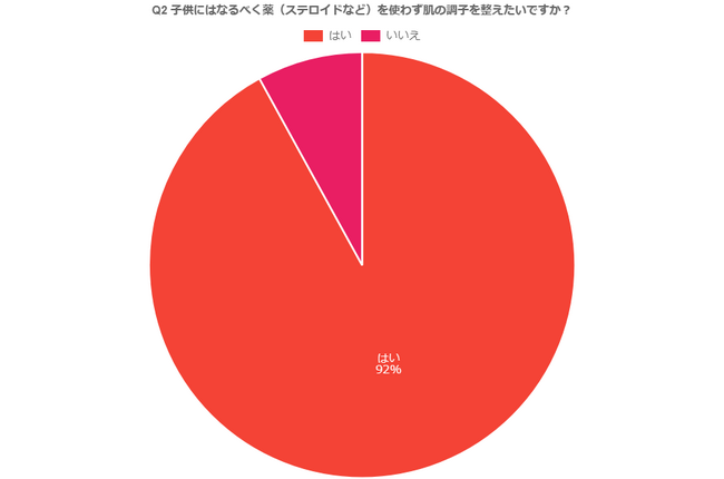 敏感肌のお子様で処方された薬を使用している方は半数以上の※64%、しかし子供になるべくステロイドなど薬を使用せずに肌の調子を整えたいか尋ねた所、はいと回答した方が92%となりました。9割以上の方が我が子には薬を使わず肌の調子を整えたい、自然なもので肌の調子が良くなればと考えていることが分かりました。