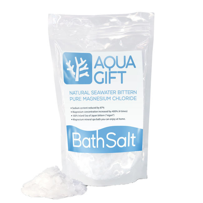 硫酸マグネシウムは一般的にエプソムソルトと呼ばれます。成分は硫酸塩とマグネシウムの化合物が結晶化したもので、食品添加物の一つ。塩化マグネシウムは一般的ににがりの主要成分のひとつと呼ばれ、海水から食塩、塩化カリウムを取り出し、分離した残りが「にがり」であり、古くから食生活に用いられています。その 「にがり」の主成分は塩化マグネシウムです。AQUAGIFTは赤ちゃんの口に入っても問題ないように塩化マグネシウム(通称にがり)天然成分100%でできています。