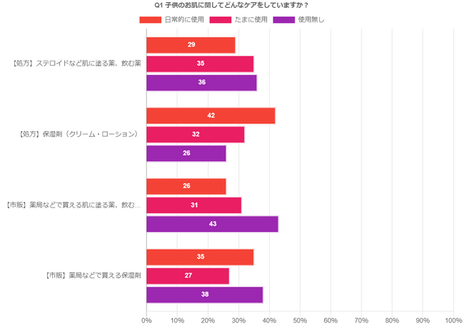 敏感肌のお子様に対して、肌ケアはしてるか尋ねたところ、何も使用しない方も一定数いらっしゃいますが、皮膚科や小児科などで処方された『保湿剤』を日常的に使用し、毎日ではないが、肌の状態をみながら時折処方された薬を使用している方が多いようです。また、病院は受診しなくても、市販の保湿剤を毎日塗っている方も多い結果となりました。