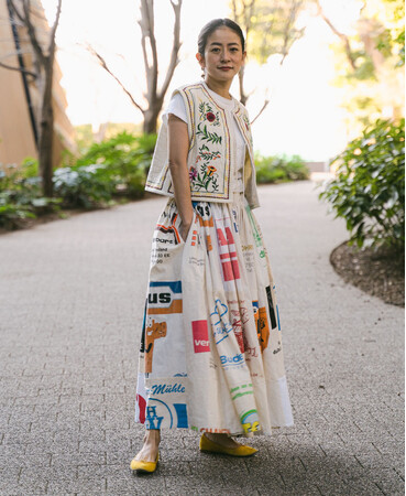 ヨーロッパのコットンバッグを解体し、スカートに仕立てたアイテム。最下段が最も幅が広くなり、足長効果があります。