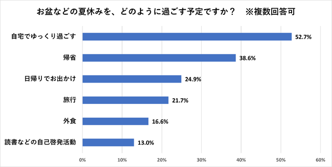 アンケートの結果、夏休みの過ごし方については「自宅でゆっくり過ごす」という回答が52.7%と最も多く、「夏休みに実家・地元へ帰省をするか」については、「夏休みに帰省する」の回答合計が61.1%と過半数を占め、「夏休みに帰省しない」の回答合計38.9%を上回る結果となりました。