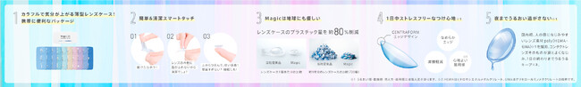 このコンセプトは、Magic独自の商品特徴によって、コンタクトレンズを使用する上での小さな煩わしさから解放され、「自由な毎日を送れるように」という思いを込めております。