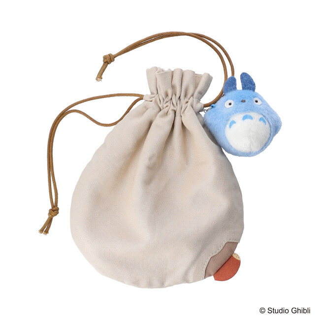 中トトロのマスコット付き巾着袋です。巾着を絞ると中トトロが大きな袋を背負っているように見え、内生地はどんぐりの総柄となっています。巾着の穴から落ちるどんぐりをダイカットの織りネームで表現した、となりのトトロのストーリーを感じさせるデザインです。