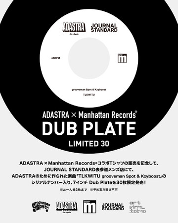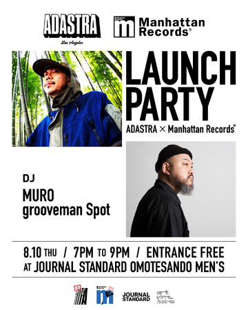 また、発売日に合わせてJOURNAL STANDARD表参道 MENS店にてローンチイベントを行います。GUEST DJには、”KING OF DIGGIN”ことDJ MUROや、先日8th album"Lie-Sense"を発表したばかりのgrooveman Spotを迎え、EVENTを開催致します。当日、会場限定スペシャル企画として、ADASTRAの為に作られた楽曲、「TLKWITU grooveman Spot & Kzyboost」の7inch DUB Plateを30枚限定(シリアルナンバー入り)を合わせて発売致します。※お一人様2枚まで。予約取り置き不可となります。