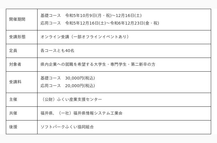 (公財)ふくい産業支援センター様、並びに福井県様と共に「ふくいITエンジニア養成スクール」を2年ぶりに開講できることを大変光栄に存じます。