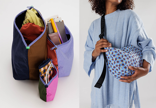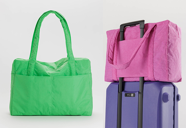 Bagguのトラベルバッグで週末をフローティング。機内持ち込みサイズのこのバッグは、座席頭上の荷物入れに簡単に収まり、ロールボードにも簡単に取り付けられます。※8月下旬発売