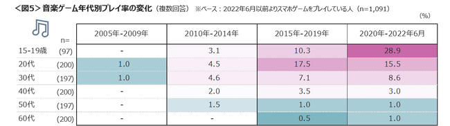 プロジェクトセカイなどの「音楽ゲーム」は最近の10代~20代のプレイ率は高いが、30代以上の年代では10%に満たない。<図5>