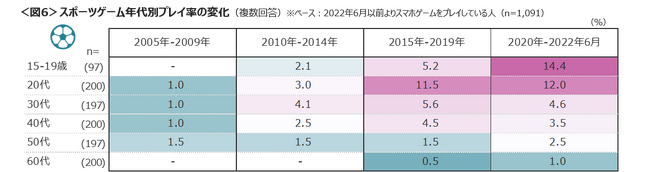 プロ野球スピリッツAなどの「スポーツゲーム」は、「音楽ゲーム」と同様に、10代~20代で遊ばれているものの、30代以上のプレイ率はわずかであった。<図6>