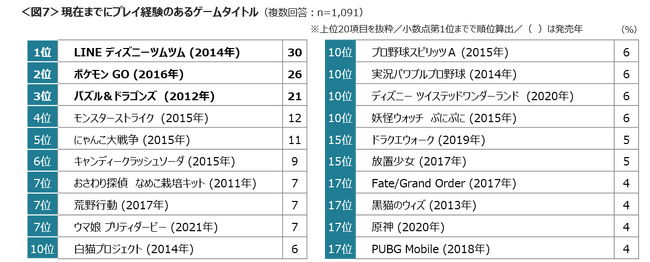 44のゲームタイトルを提示し、過去にプレイしたゲームを聴取した。「LINEディズニーツムツム」30%、「ポケモンGO」26%、「パズル&ドラゴンズ」21%が上位、次いでアクションRPGの「モンスターストライク」12%、ストラテジーゲームの「にゃんこ大戦争」11%と多岐にわたるジャンルのタイトルがあがった。<図7>