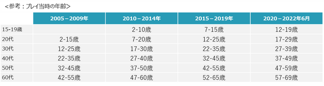 プレイ率TOP5のジャンルについて、年代別のプレイ率の変化を確認した。スマートフォンの普及が拡大していた2015年から「パズルゲーム」のプレイ率は上昇している。若年層から高年層まで全世代でのプレイ率が高めであり、特に50~60代の2020年~2022年6月のプレイ率は4割を超える。<図2>