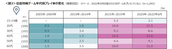 ポケモンGOやドラクエウォークに代表される「位置情報ゲーム」のプレイ率は現在の40代が高く、当時30代だったころにプレイ率が上がっている。全世代の2015年~現在までプレイ率は、大きく下がることなく継続的に推移している。<図3>