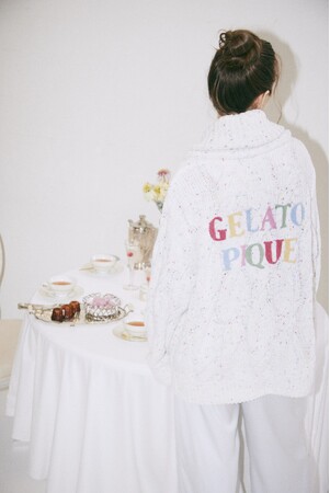 カラースプレーのデザインを散りばめたアラン編みの層と、ふわふわな肌触りが人気な'ジェラート'素材をケーキのように重ね合わせた特別なニットです。