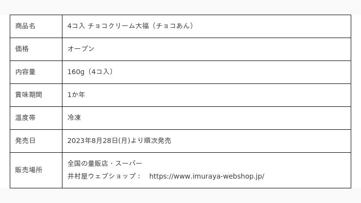 井村屋株式会社(本社:三重県津市高茶屋七丁目1番1号、社長:岩本 康)は、包みたてのおいしさがそのまま味わえる冷凍和菓子シリーズから、『4コ入 チョコクリーム大福(チョコあん)』を2023年8月28日(月)より全国の量販店・スーパー、井村屋ウェブショップにて季節限定で発売します。