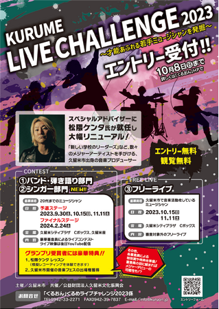 才能あふれる若手ミュージシャンの発掘を目的として開催する、「くるめライブチャレンジ2023」の出場者を募集します。市出身の音楽プロデューサー松隈ケンタが「スペシャルアドバイザー」に就任し、グランプリ受賞者には豪華特典を付与します!