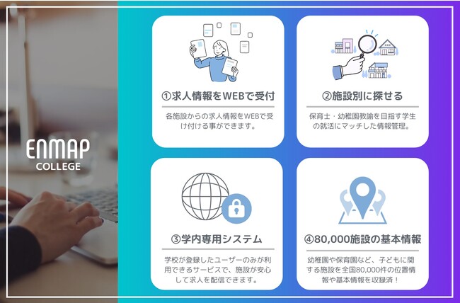 『ENMAP COLLEGE(https://kaseki.co.jp/enmap_college_forschool)』は、求人情報を送りたい幼保施設と、情報を受け取る保育士養成校と所属学生が、WEBを通じてシームレスに連携できるサービスです。