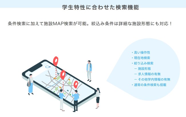 本サービスは、設立形態(3種類)・施設種別(25種類)・学内求人有無などから絞込みが可能で、地元就職の比率が高い業界に合わせて「勤務地」をMAPから検索できる機能を搭載しており、これにより具体的に検討すべき施設を簡単に洗い出すことが可能です。