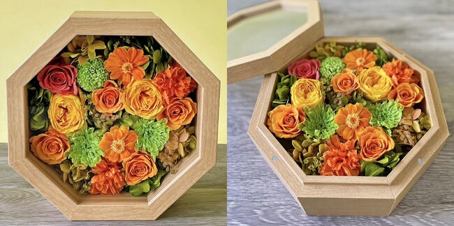 バラをメインにしたオレンジ系の花々は、華やかでありながらも秋を感じさせるデザインです。フレームを立てて飾ることもそのまま置いて飾ることもできます。