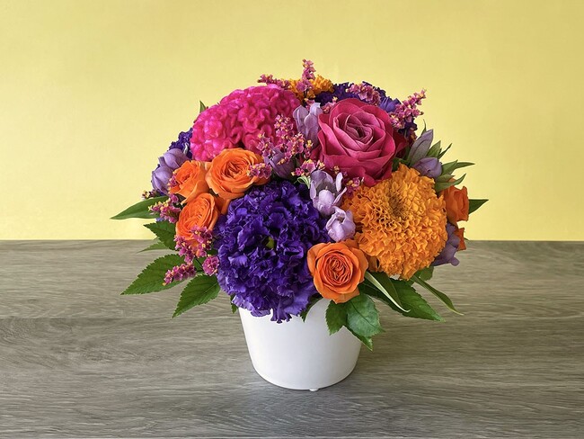 鮮やかなオレンジと紫のコントラストが落ち着いた大人の雰囲気のアレンジメントです。縁起の良い色の花々を組み合わせているので、「敬老の日」のギフトにぴったりなデザインです。こちらのアイテムはオンラインショップでもお買い求めいただけます。