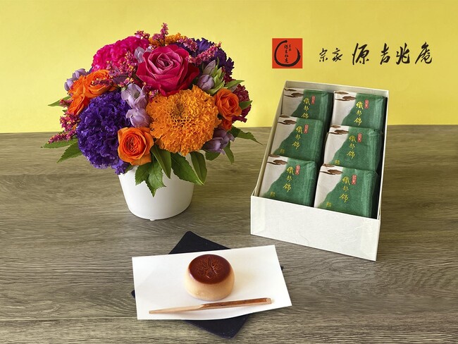 器付きのため花瓶に移し替える必要がなく、そのまま飾っていただける大人の雰囲気のアレンジメントと宗家 源 吉兆庵 の人気定番菓子、織部錦を組合せました。