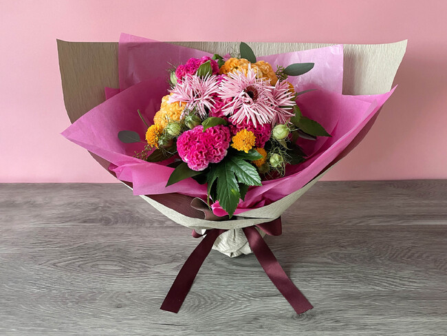 秋はシックで落ち着いた色合いの花も多いですが、今回はおじいちゃん、おばあちゃんに感謝に気持ちをビビットな花色にのせて届けるべく、敬老の日にもぴったりな華やかなアイテムにデザインしました。