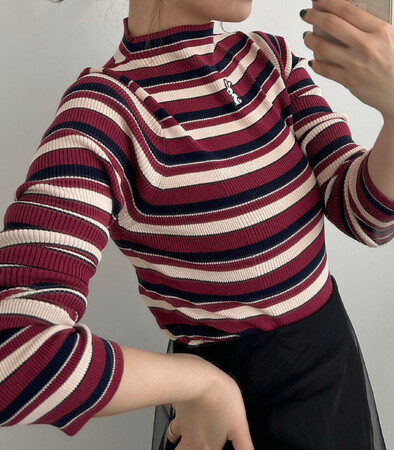 1.ウサギ刺繍ボーダーリブニット