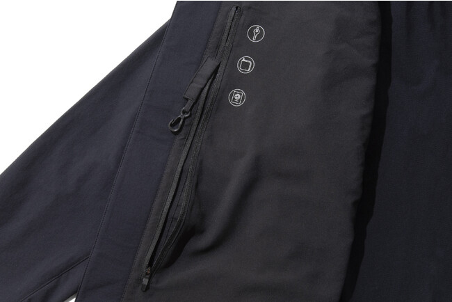 コート、フーディ、ジャケットには、イヤホン/スマートフォン/鍵/財布/パスポート/モバイルパッドなど、収納できるアイテムのアイコンが付いた多機能ポケットを備え、バッグを持たずとも自由に動ける収納力を確保しました。